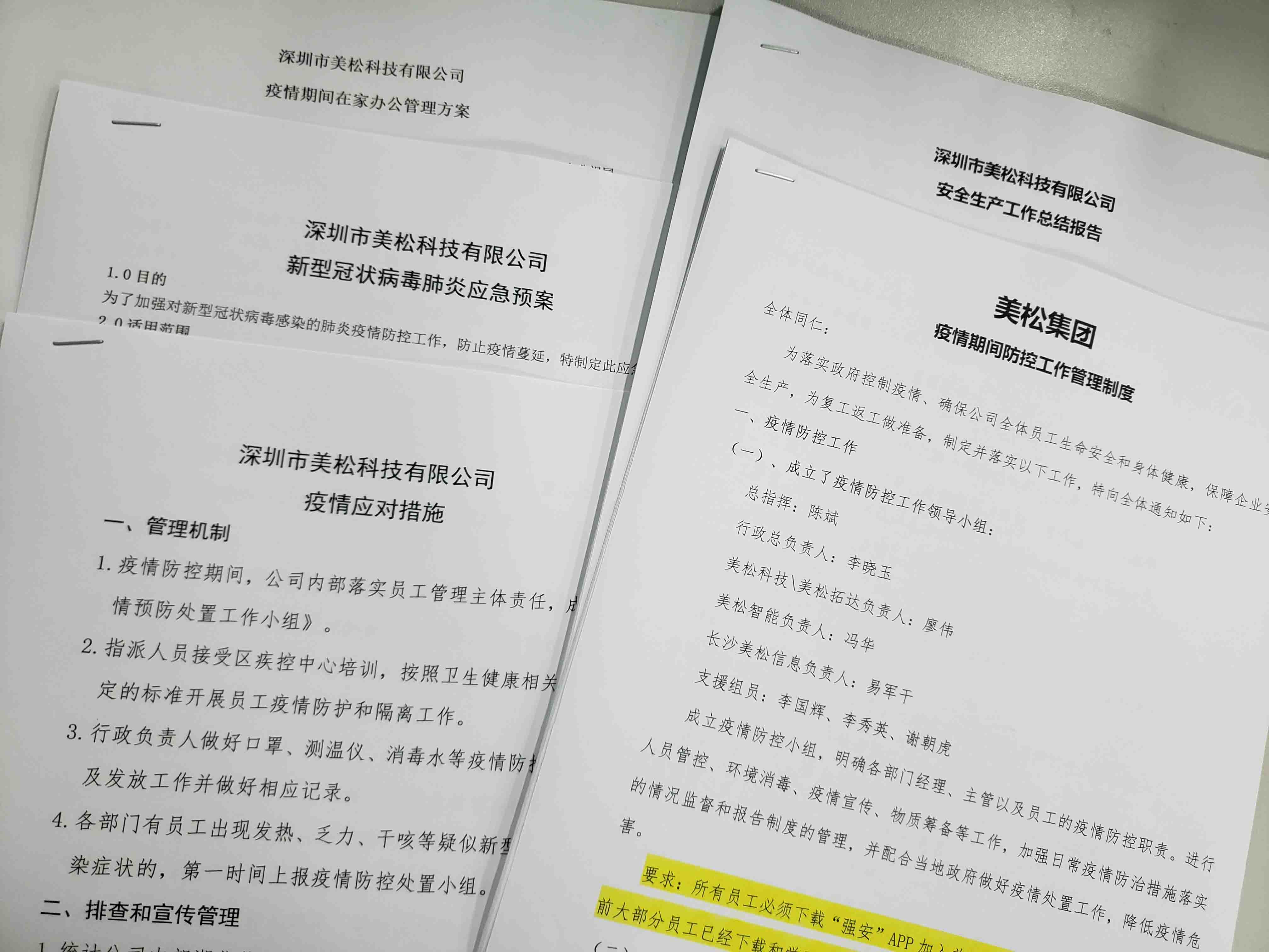 開工復工在即,我們美松集團及各下屬子公司也做了充分準備工作,面對如此特殊疫情時期,深圳美松集團特制定了《疫情期間防控工作管理制度》、《疫情期間在家辦公管理方案》、《安全生產(chǎn)工作報告》、《應對疫情應對措施》、《新型冠狀病毒應急預案》,利用網(wǎng)絡、電話、現(xiàn)場等多種形式相結合的方式為客戶提供服務,保障客戶需要,通過差異化的管理,做到疫情防控和經(jīng)營服務“兩不誤”。無論是在家辦公,還是到崗辦公,全體員工全身心投入到工作當中,保持著積極的工作熱情。