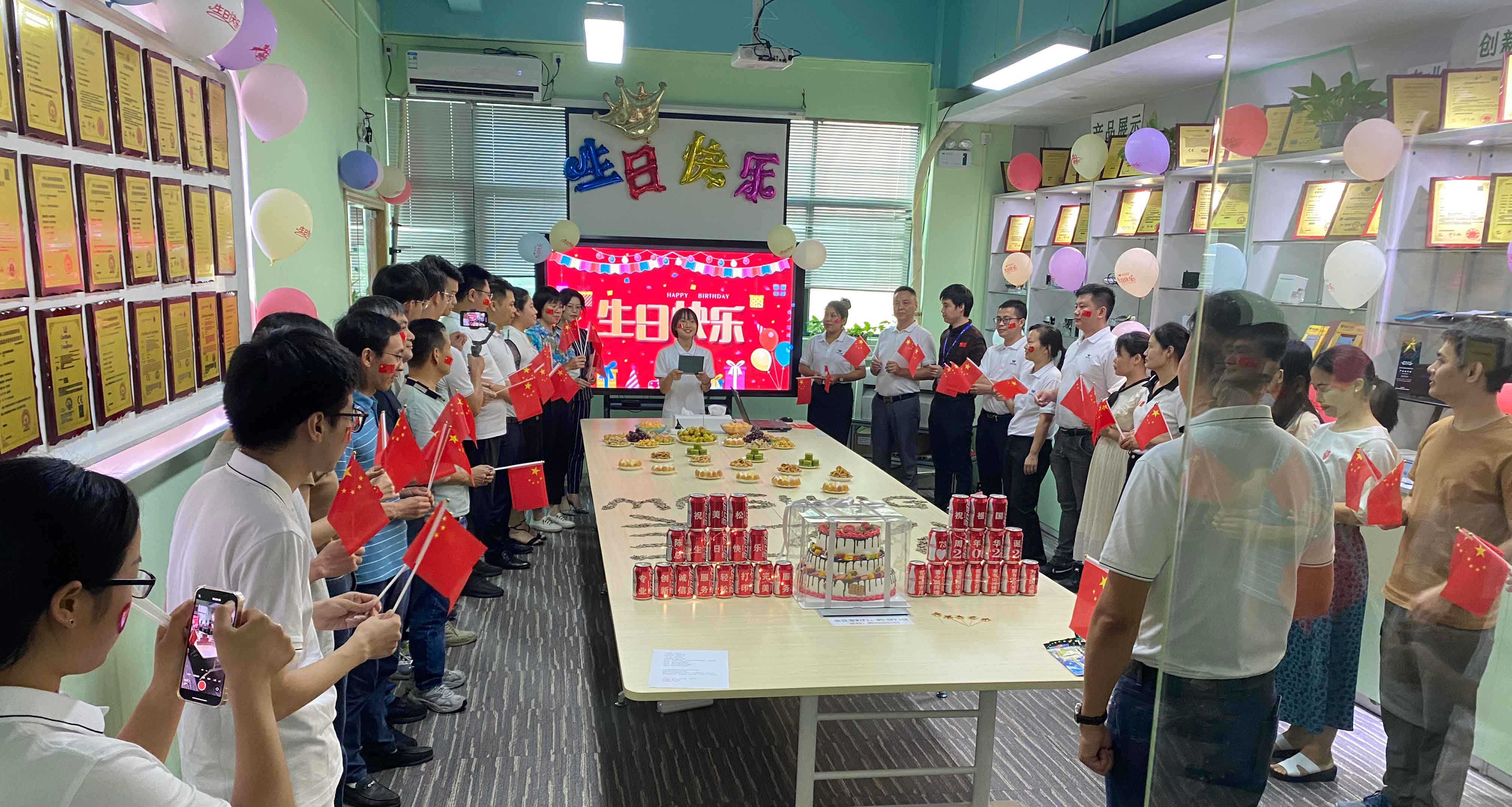 下午3點(diǎn)半,伴隨著現(xiàn)場優(yōu)美歡快的生日歌聲,同事們排起長隊(duì),人手一面紅旗,個個洋溢著歡快的笑容,列隊(duì)大步邁向慶祝會場,頓時,辦公室成了紅色的海洋,同時我們的慶祝會正式拉開帷幕。