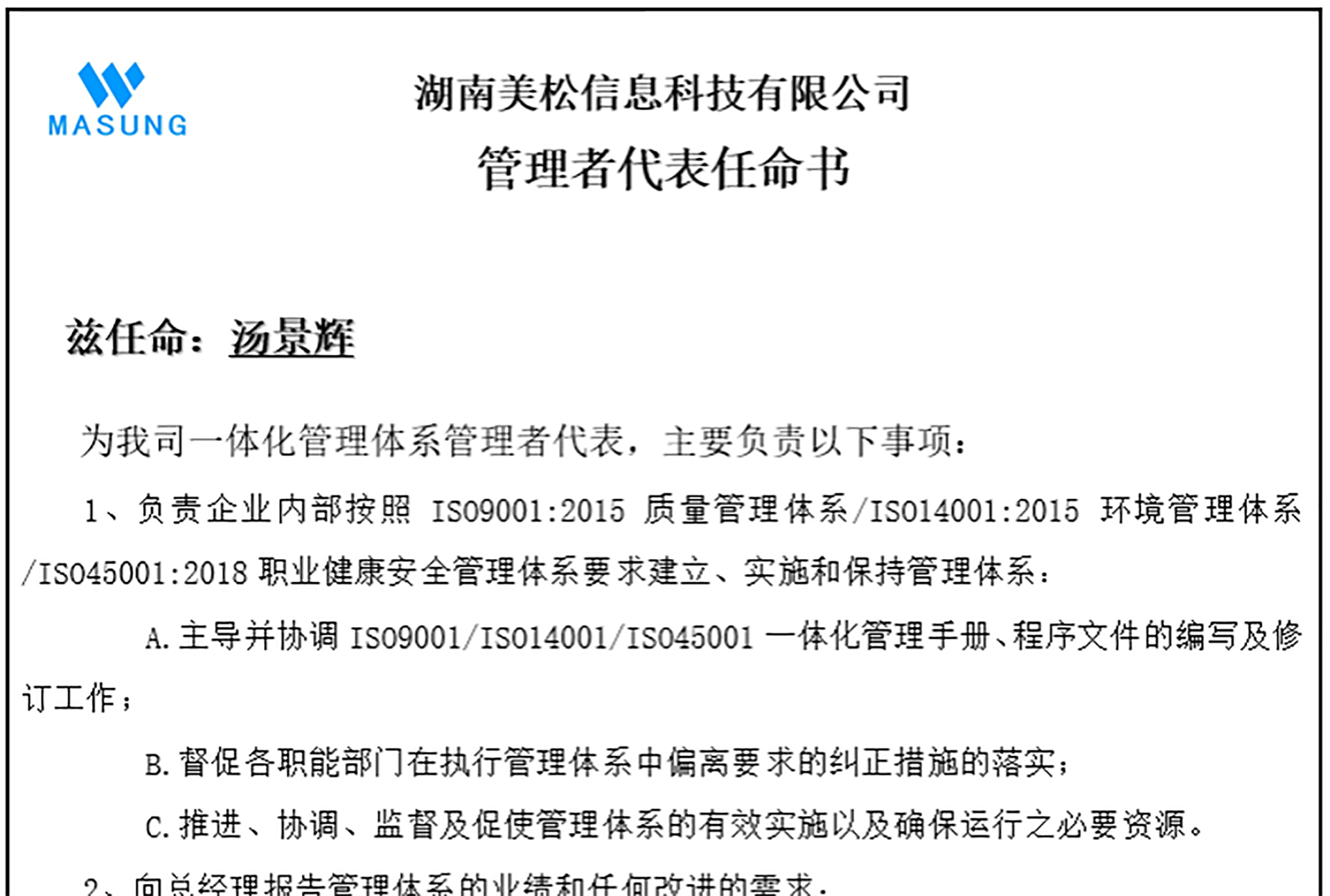 總經辦董事長助理Coco代表公司,正式授予制程工程部湯景輝同志“管理者代表”任命書。也表達了對湯景輝的充分信任和厚望,希望他能帶領大家把體系管理工作做得扎實又創(chuàng)新。并向所有部門管理人員發(fā)出號召:以體系管理為抓手,優(yōu)化流程、提升品質、降低風險,把企業(yè)打造得更加安全卓越!