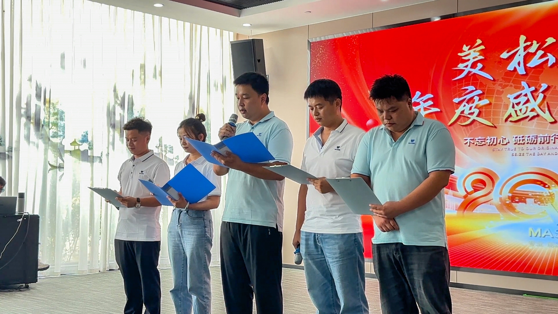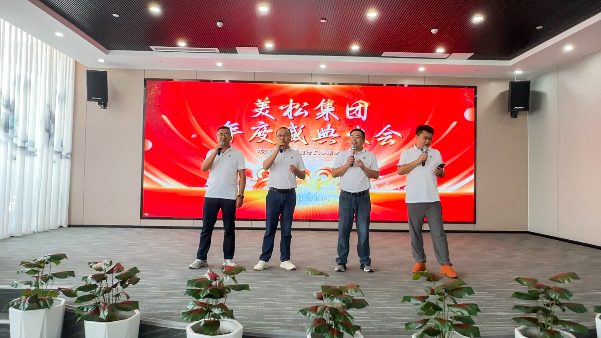 四位主持人整齊亮相開(kāi)啟序幕,由美松智能銷售部總經(jīng)理李光輝帶領(lǐng)的” 四大金剛”上臺(tái)領(lǐng)唱美松主題曲《我的夢(mèng)》,當(dāng)歌聲響起,現(xiàn)場(chǎng)激勵(lì)氣氛高漲。