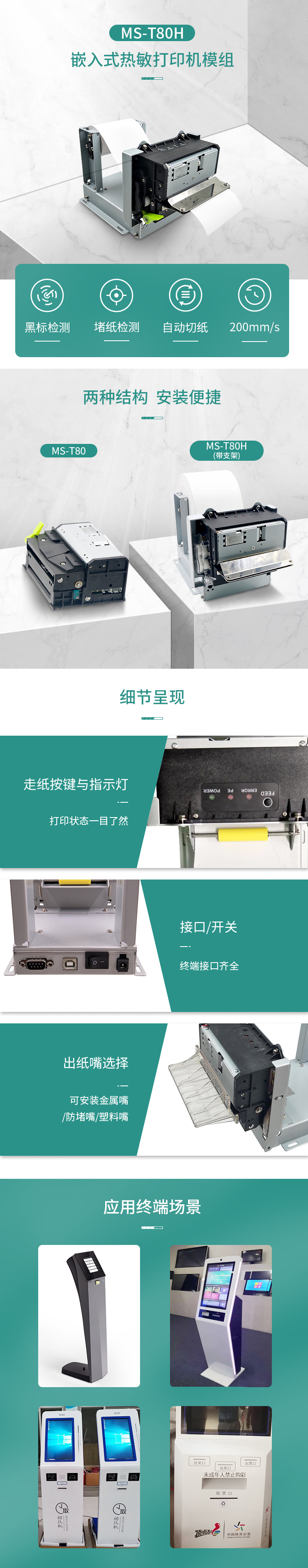 MS-T80/H 打印模塊采用AOI行式熱敏打印頭片,它具有高速打印、噪聲低、 可靠性強(qiáng)、打印質(zhì)量高。該打印機(jī)結(jié)構(gòu)小巧、同時(shí)擁有自動(dòng)進(jìn)紙、自動(dòng)切紙、黑 標(biāo)檢測(cè)、紙將盡檢測(cè)等功能。 此模組 ALL-IN-ONE,控制板與機(jī)芯完全結(jié)合為一體,大大節(jié)省了模組的空 間,極大地方便了模具的開(kāi)發(fā)設(shè)計(jì)。此打印機(jī)擁有走紙按鍵及指示燈,讓終端用 戶(hù)使用起來(lái)更簡(jiǎn)單、流暢。打印機(jī)適應(yīng)領(lǐng)域:適用于自助查詢(xún)終端、排隊(duì)機(jī)、ATM、彩票打印、日志打 印、自助話費(fèi)清單打印機(jī)、自助發(fā)票打印、自助繳費(fèi)機(jī)等領(lǐng)域的使用。