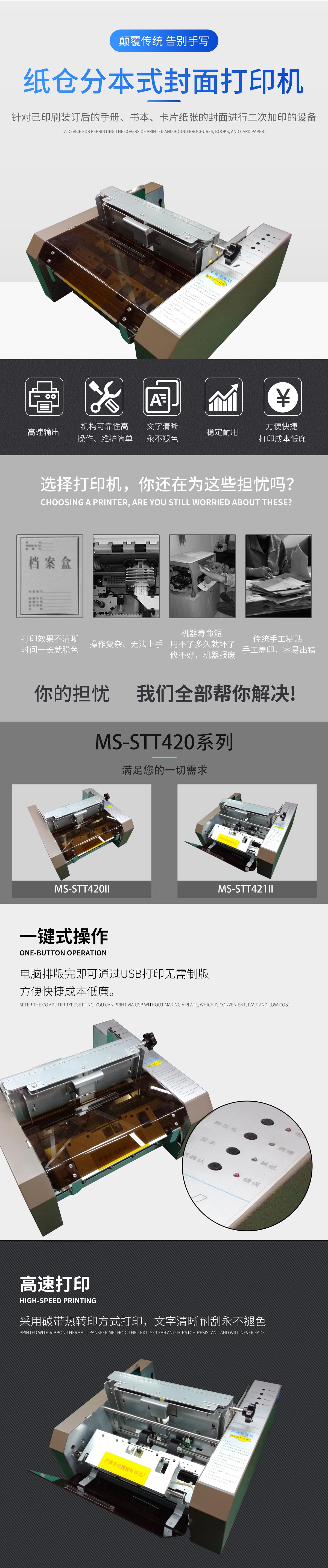 美松MS-STT420II是熱轉(zhuǎn)印設(shè)備,利用熱轉(zhuǎn)印技術(shù),實(shí)現(xiàn)紙倉分本式封面打印機(jī)針對已印刷裝訂后的手冊,書本,卡片紙張的封面進(jìn)行二次加印的設(shè)備.采用碳帶熱轉(zhuǎn)印方式打印,文字清晰耐刮永不褪色.電腦排版完即可通過USB打印無需制版,方便快捷成本低廉.可調(diào)打印件厚度及可調(diào)紙倉式多本裝入,機(jī)構(gòu)可靠性高,操作,維護(hù)簡單.