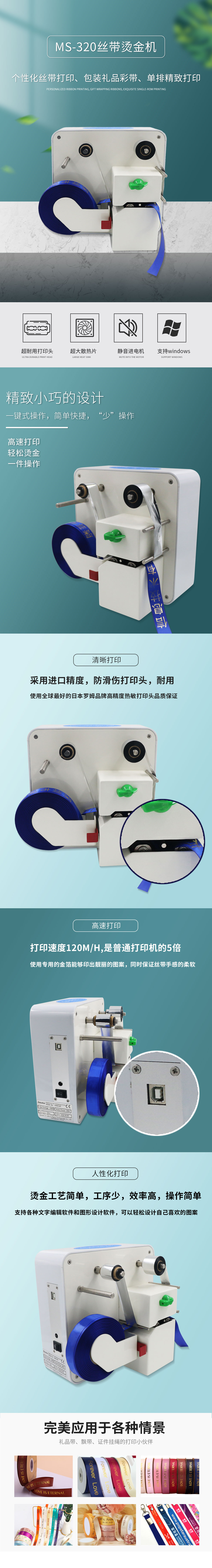 美松全自動絲印機 1.機器體積小巧,美觀(桌面擺設) 2.速度快(是普通打印機的5倍) 3.在絲帶上打印精美的圖案,文字,標志 4.使用專用的金箔能夠印出靚麗的圖案,同時保證絲帶手感的柔軟 5.支持各種文字編輯軟件和圖形設計軟件,自定義打印商標和文字