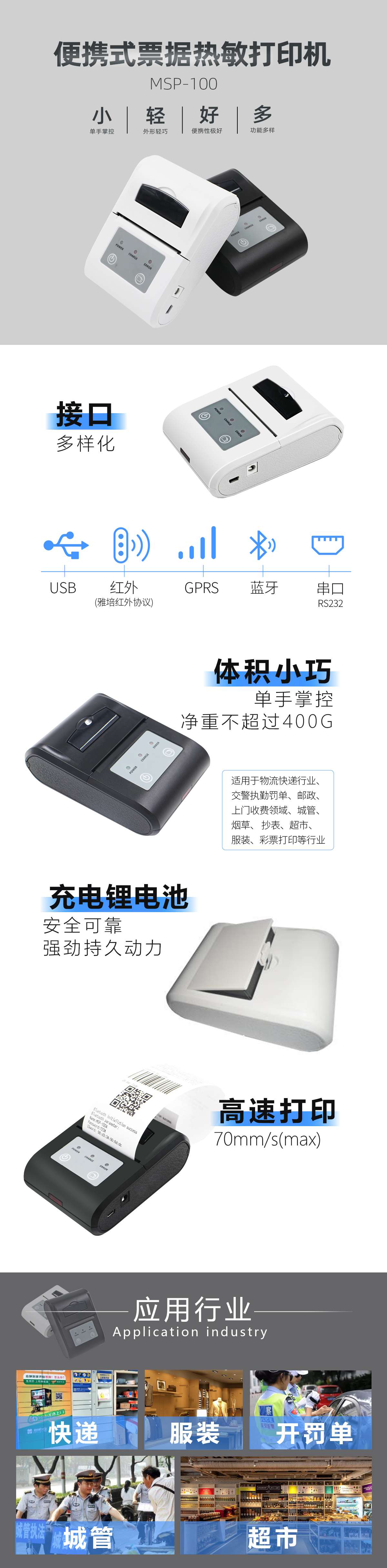 美松MSP-100打印機(jī)58mm微型熱敏POS小票據(jù)打印機(jī),支持紅外(雅培紅外協(xié)議)接口,GPRS接口,USB接口,藍(lán)牙接口,串口RS232接口,鋰電池充電,適應(yīng)用于物流快遞行業(yè),交警執(zhí)勤罰單,郵政,上門收費(fèi)領(lǐng)域,城管,煙草,抄表,超市,服裝,彩票打印等行業(yè)的使用.支持多種一維條形碼&二維碼功能的打印,支持GB18030漢字庫,可高速打印漢字.