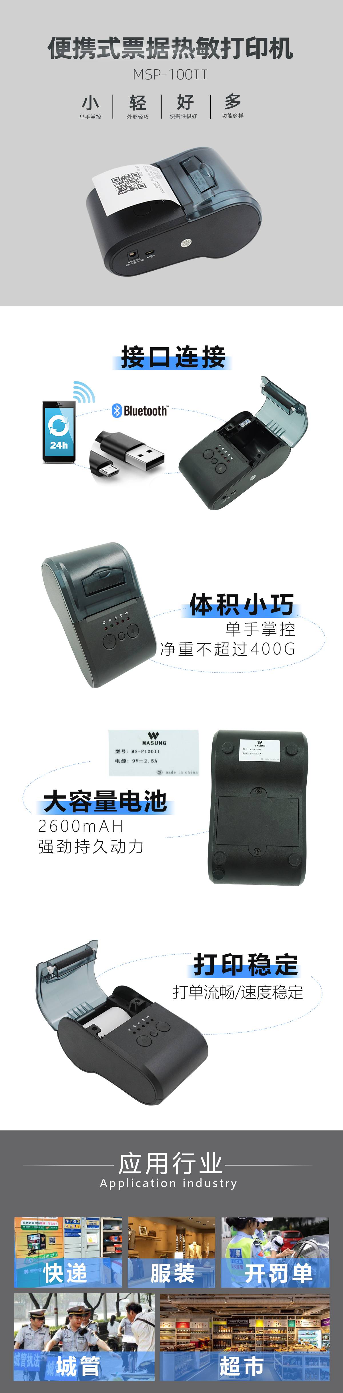 美松MSP-100II系列打印機(jī)是微型熱敏POS小票打印機(jī),支持多種一維條形碼&二維碼功能的打印,支持GB18030漢字庫,可高速打印漢字,接口類型:藍(lán)牙接口,mircoUSB接口.設(shè)計(jì)精巧,性能穩(wěn)定,外觀時(shí)尚.