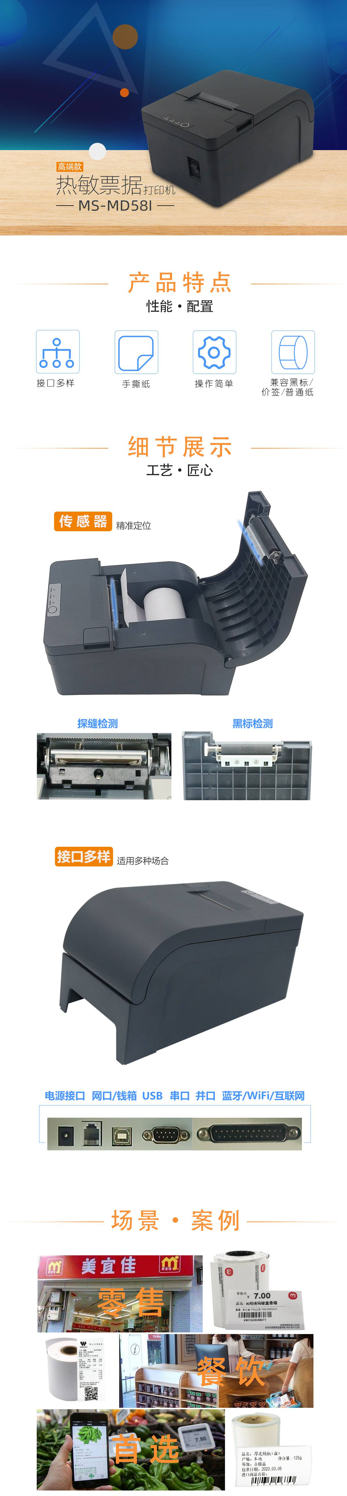 美松MS-MD58I打印機(jī)是熱敏小票打印機(jī)58mm前臺后廚房超市餐廳收銀票據(jù)打印機(jī),用于便利店商超餐飲收銀,可滿足價簽打印,熱敏紙打印,黑標(biāo)紙打印,不干膠紙打印,標(biāo)簽紙打印功能;具有高速打印,噪聲低,可靠性強(qiáng),打印質(zhì)量高,切紙厚度大,結(jié)構(gòu)小巧等特點(diǎn);打印機(jī)擁有易裝紙,手撕切紙等功能.