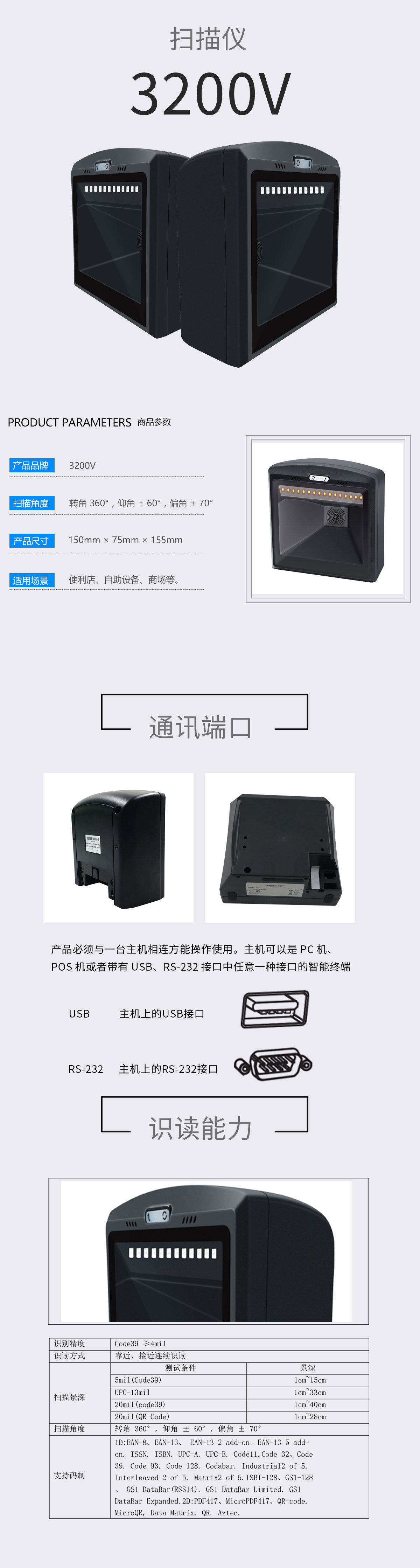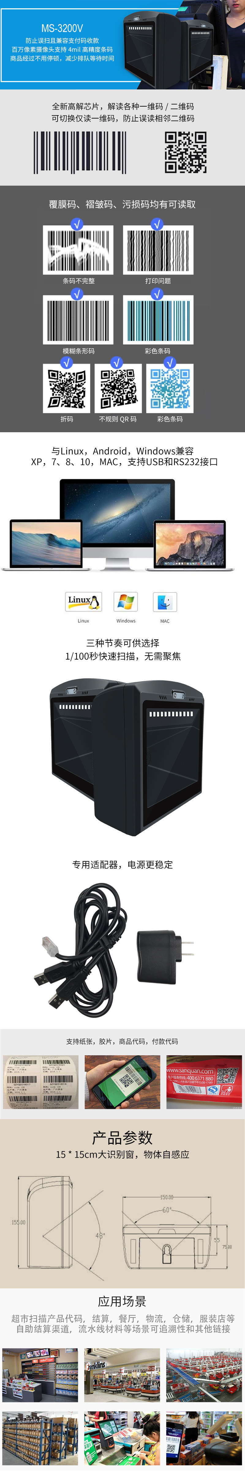 美松二維碼掃描平臺(tái)MS-3200V掃描完全自主研發(fā),擁有全套專利,即插即用無需安裝驅(qū)動(dòng).寬電壓設(shè)計(jì),專用適配器,供電更穩(wěn)定,避免了因電壓波動(dòng)導(dǎo)致數(shù)據(jù)傳輸無法上傳情況的發(fā)生.采用 32 位主控芯片搭載專利軟體,可順暢解讀反光,打皺,模糊,彩色條碼,強(qiáng)光及暗光環(huán)境下也可正常解碼.采用全鉭電容及抗氧化光學(xué)工藝,避免了傳統(tǒng)掃描槍使用一段時(shí)間后靈敏度下降問題.二維影像式掃描平臺(tái),掃描槍,掃碼器,餐飲零售,快遞倉儲(chǔ),物流超市,商品條碼,手機(jī)屏幕掃碼收款.兼容Linux,Android,Windows XP,7,8,10,MAC,支持USB和RS232接口.支持紙質(zhì),薄膜類,商品碼,付款碼讀取,支持低對(duì)比度,高密度的DM碼等的讀取.