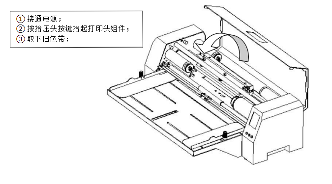 第一步:按下打印機上抬壓頭按鍵,打印頭組件會自動抬起。