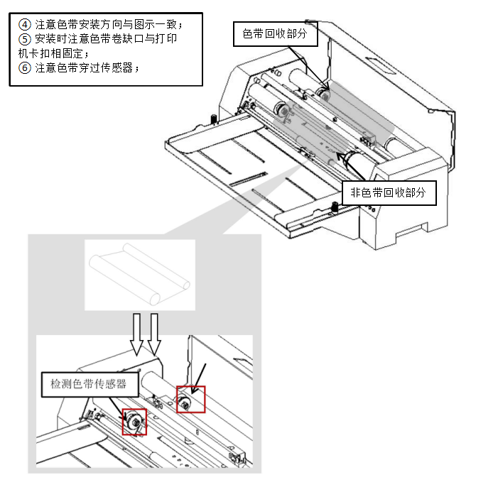 第三步:將色帶(主軸)一端繞過熱敏片,注意色帶必須穿過傳感器位置,將回收色帶部分如圖所示方向卷起,先用力按壓彈力座一邊將色帶裝入, 再在另外一邊對準(zhǔn)卡扣位置安裝,色帶安裝完成后。通電,按收色帶按鍵可收緊色帶,并按抬壓頭按鍵歸位。