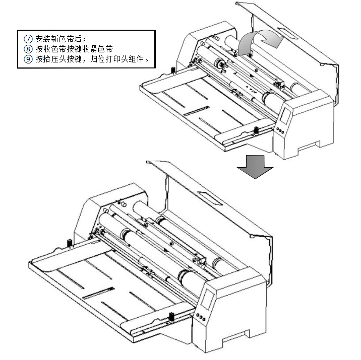 7.抬壓頭設(shè)計,碳帶打印機換碳帶視頻。