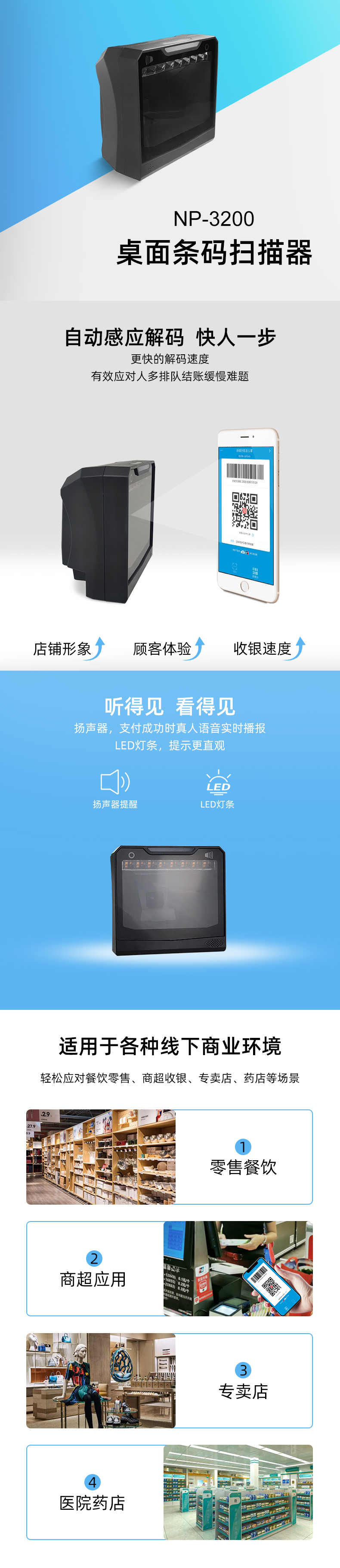 全新的觸摸屏模式,讓模式切換更順暢 可隨意調(diào)節(jié)聲音大小 適用于各種新零售行業(yè),紙質(zhì)條碼與手機條碼間流暢切換