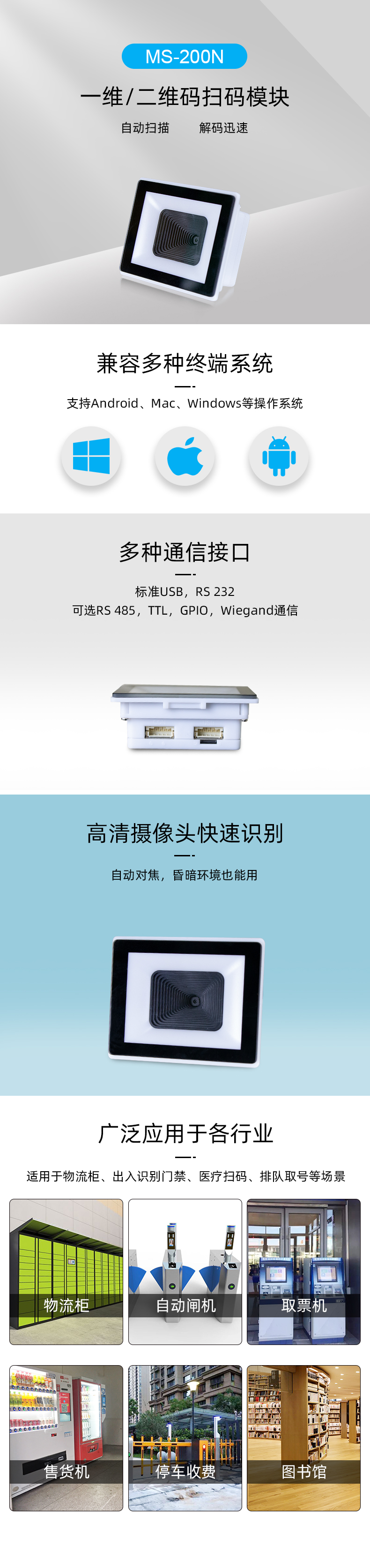 可選刷卡模塊可支持13.56Mhz,非接觸式IC讀卡器,支持Type A/B卡