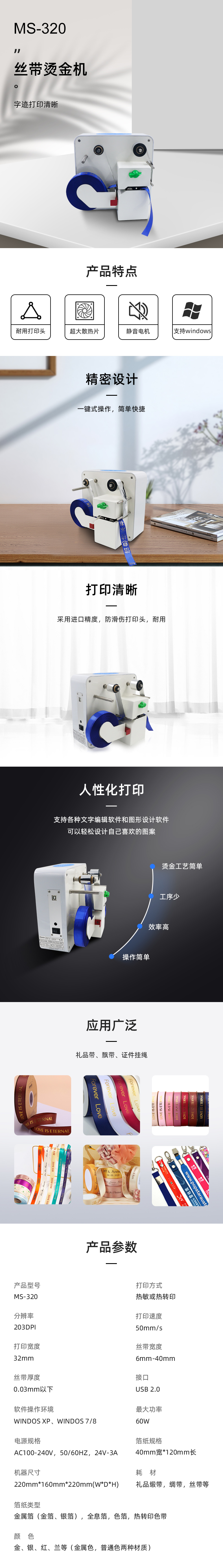 美松全自動(dòng)絲印機(jī) 1.機(jī)器體積小巧,美觀(桌面擺設(shè)) 2.速度快(是普通打印機(jī)的5倍) 3.在絲帶上打印精美的圖案,文字,標(biāo)志 4.使用專(zhuān)用的金箔能夠印出靚麗的圖案,同時(shí)保證絲帶手感的柔軟 5.支持各種文字編輯軟件和圖形設(shè)計(jì)軟件,自定義打印商標(biāo)和文字