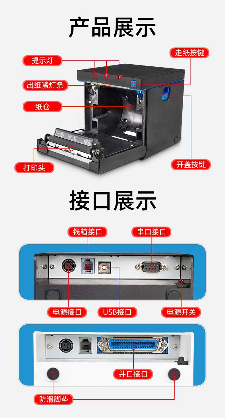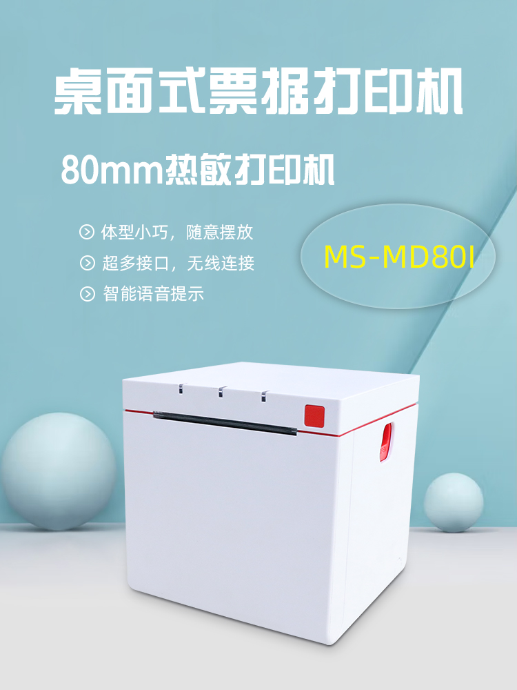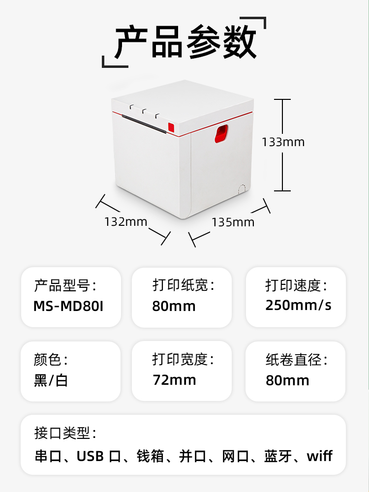 MD80I是一款高顏值的可桌面也可壁掛的票據(jù)打印機(jī)。MD80I外形四四方方的,圓潤(rùn)一體設(shè)計(jì)、簡(jiǎn)于外,精于內(nèi)。流線造型,外觀簡(jiǎn)潔大方。顏色搭配顯得更加干凈整潔,可內(nèi)嵌于一些自助ai設(shè)備上,也可直接進(jìn)行使用。MS-MD80I是一款全能的桌面式壁掛式票據(jù)打印機(jī),適用于零售商超、中小電商、倉(cāng)儲(chǔ)物管、影院娛樂(lè)等行業(yè)領(lǐng)域,支持簡(jiǎn)體/繁體、英/日/韓文多種國(guó)際語(yǔ)言,新零售、跨境電商、影院更適合。MS-MD80I擁有超高速打印速度,采用高級(jí)強(qiáng)勁機(jī)芯,打印速度可高達(dá)250MM/S成為市面上同類產(chǎn)品中快速打印的佼佼者,清晰穩(wěn)定與高速皆可兼得帶來(lái)顧客滿分體驗(yàn)。MS-MD80I擁有豐富的可選接口,支持RS232串口、USB、網(wǎng)口,可選配藍(lán)牙、WiFi等接口、同時(shí)支持24V錢箱接入、滿足不同的連接需求。專業(yè)黑標(biāo)定位功能,前出紙打印,無(wú)線連接,藍(lán)牙接口連接,WiFi接口連接,USB連接,打印機(jī)外殼材質(zhì)高端,內(nèi)置機(jī)芯打印速度快。