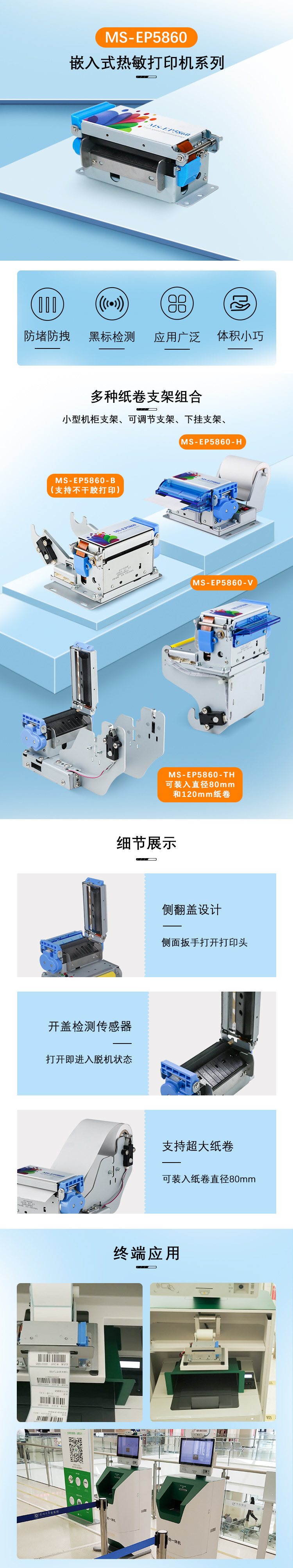 4.兼容各種苛刻的適用環(huán)境,結構設計可定制衍生,實現易維護易安裝,整機尺寸小巧靈活,支持紙卷后放MS-EP5860-V或下放MS-EP5860-H結構,根據終端設備的需求選配。