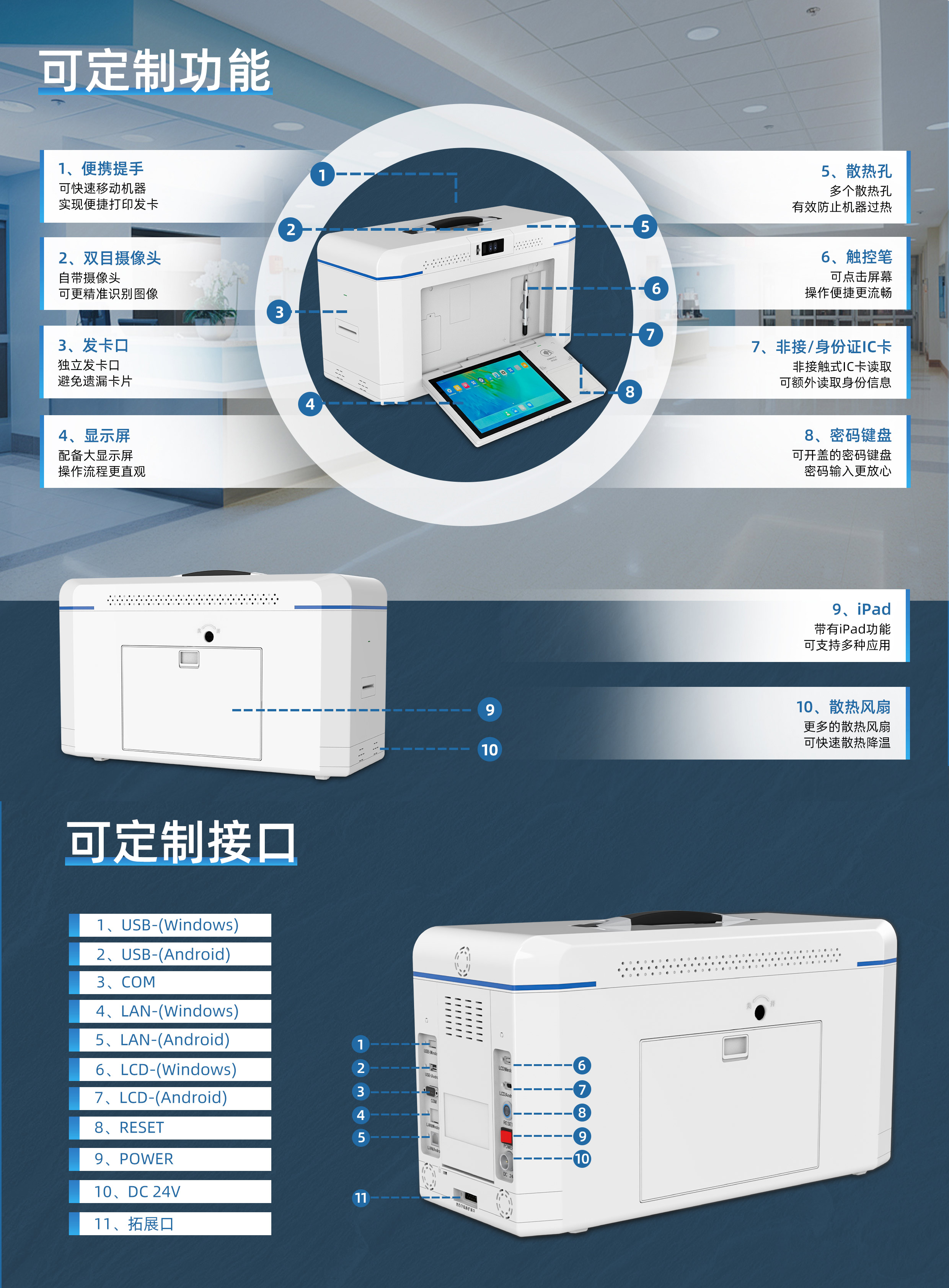 MS-ACT812是一款可移動的便攜發(fā)卡機,具有多種功能選擇,帶有雙目攝像頭和單獨的顯示屏,同時具有觸控筆可用于點擊屏幕,此外還有iPad功能可支持多種應(yīng)用,可讀取非接觸IC卡和身份證和身份識別卡,帶有密碼鍵盤可用于輸入密碼