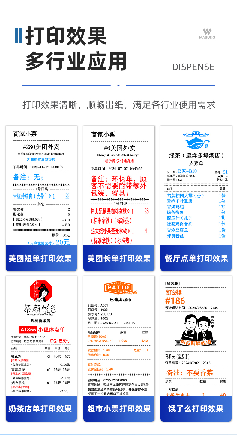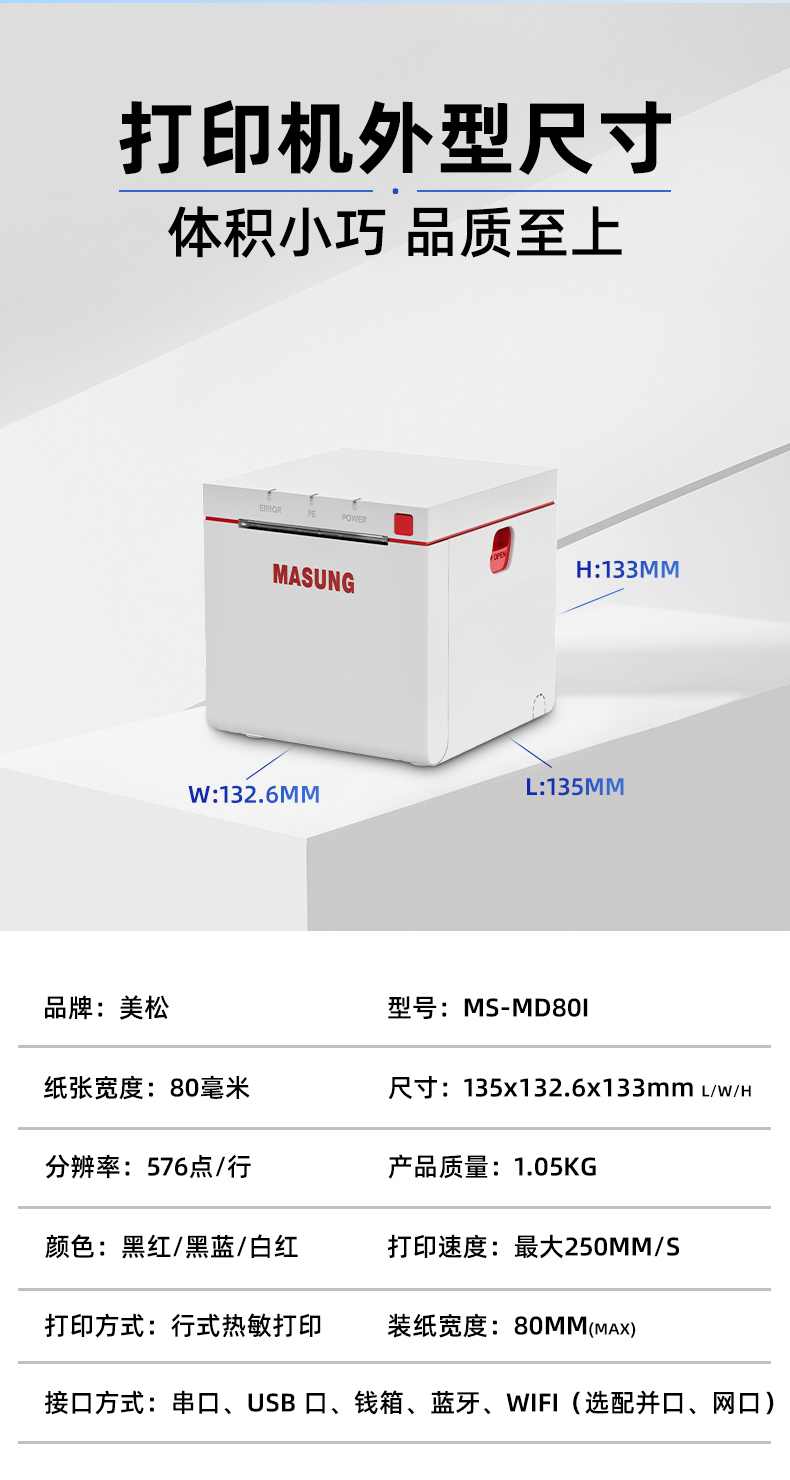 MD80I是一款高顏值的可桌面也可壁掛的票據(jù)打印機。MD80I外形四四方方的,圓潤一體設(shè)計、簡于外,精于內(nèi)。流線造型,外觀簡潔大方。顏色搭配顯得更加干凈整潔,可內(nèi)嵌于一些自助ai設(shè)備上,也可直接進行使用。MS-MD80I是一款全能的桌面式壁掛式票據(jù)打印機,適用于零售商超、中小電商、倉儲物管、影院娛樂等行業(yè)領(lǐng)域,支持簡體/繁體、英/日/韓文多種國際語言,新零售、跨境電商、影院更適合。MS-MD80I擁有超高速打印速度,采用高級強勁機芯,打印速度可高達(dá)250MM/S成為市面上同類產(chǎn)品中快速打印的佼佼者,清晰穩(wěn)定與高速皆可兼得帶來顧客滿分體驗。MS-MD80I擁有豐富的可選接口,支持RS232串口、USB、網(wǎng)口,可選配藍(lán)牙、WiFi等接口、同時支持24V錢箱接入、滿足不同的連接需求。專業(yè)黑標(biāo)定位功能,前出紙打印,無線連接,藍(lán)牙接口連接,WiFi接口連接,USB連接,打印機外殼材質(zhì)高端,內(nèi)置機芯打印速度快。