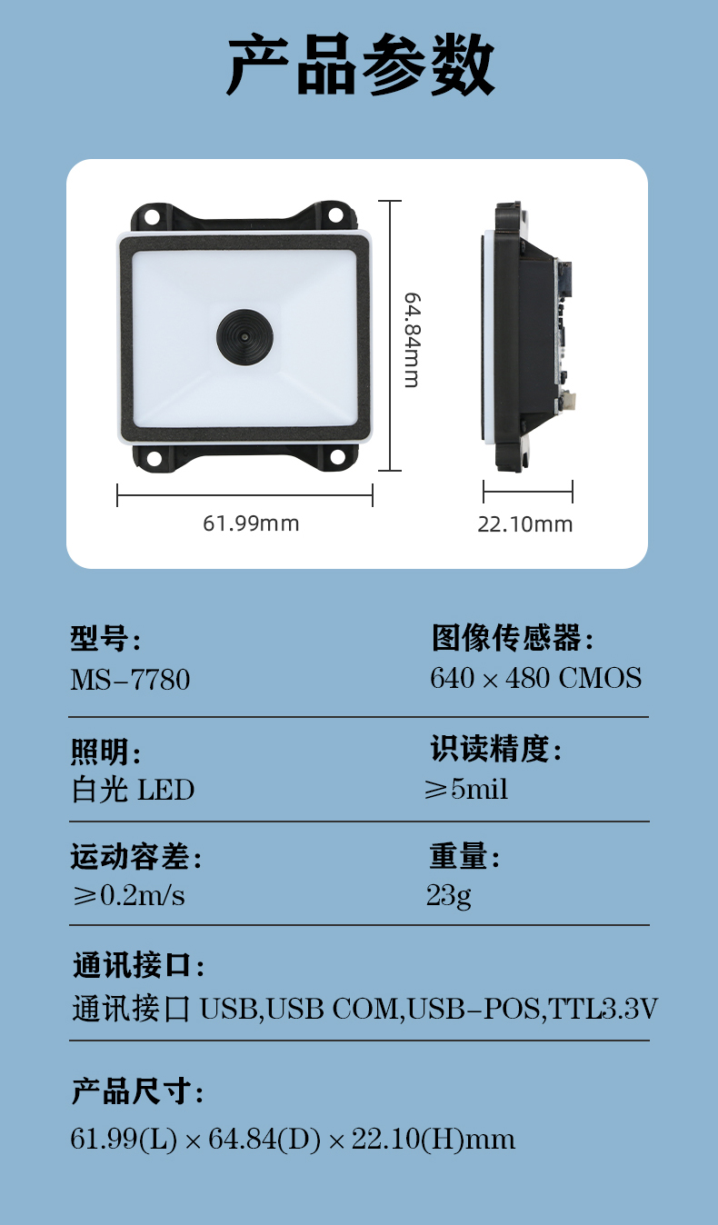 采用自主研發(fā)的核心技術(shù),極速響應(yīng),支持快速開發(fā)和定制需求手機(jī)可以貼的更近整機(jī)厚度僅 21MM,更方便集成超強(qiáng)電子屏碼解析對(duì)高密,低對(duì)比度,色彩條碼有較強(qiáng)的解析能力多種接口協(xié)議:USB、USB COM、TTL3.3V、等接口;物理接口形態(tài)有 12PIN 0.5mmFPC(選配)和6PIN MX1.25 間距端子座