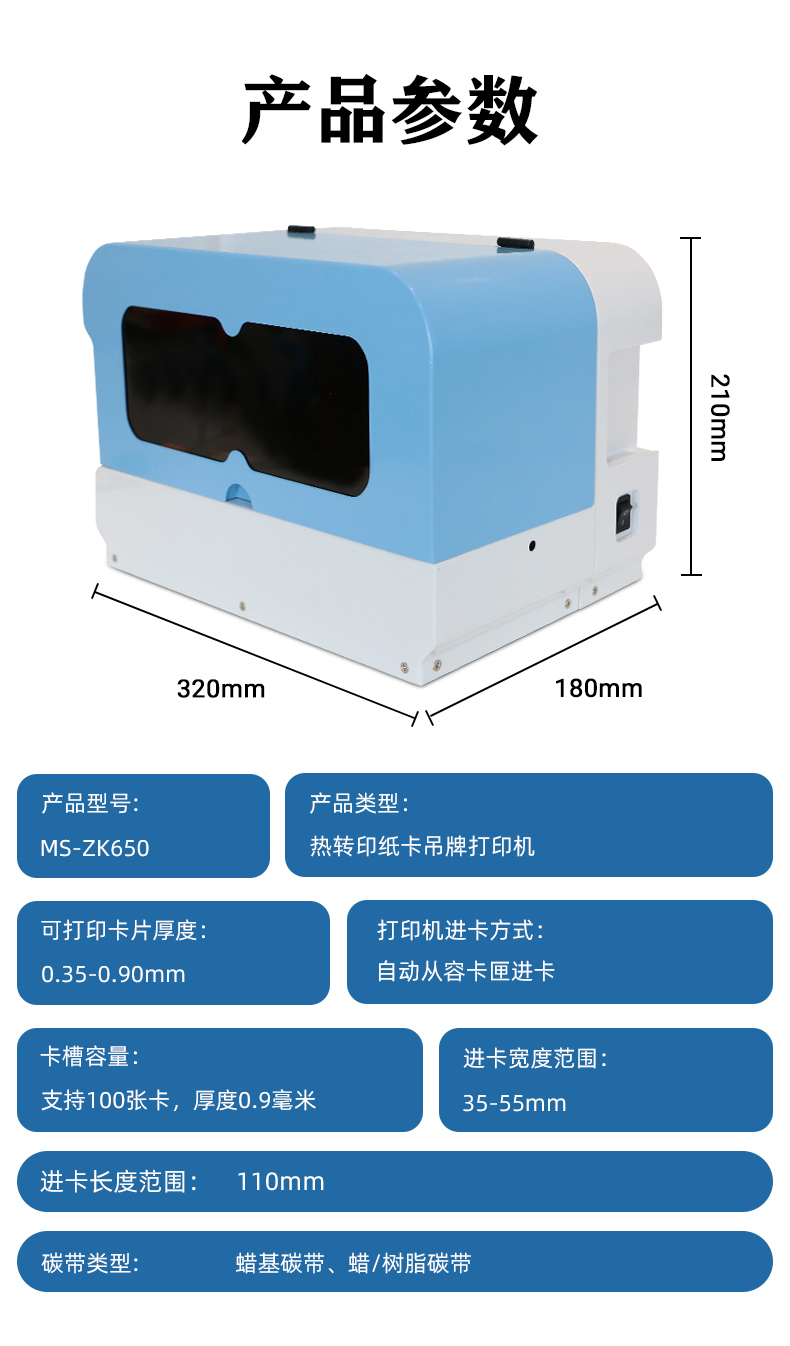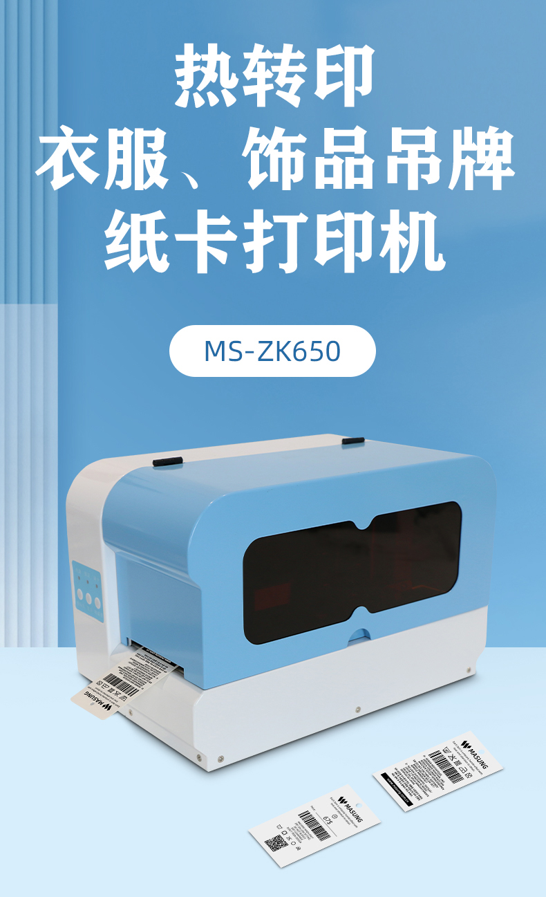MS-ZK650_熱轉(zhuǎn)印紙卡吊牌打印機,是由美松自主研發(fā)的一款熱轉(zhuǎn)印類型的卡片打印機,主要應(yīng)用于衣物、飾品價格吊牌或洗滌吊牌的打印,打印的卡寬度在35-55mm之間,最大長度為110mm,MS-ZK650可打印的最大寬度在55MM,可裝入的紙卡寬度為0.35mm-0.9mm,最大可裝入0.9mm的紙卡100張。