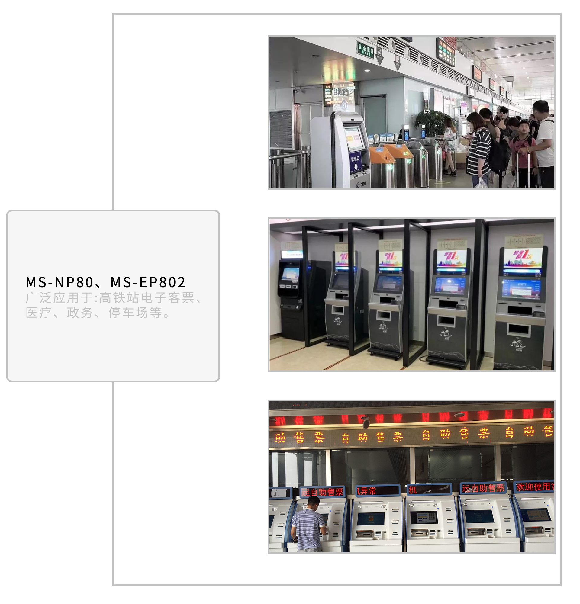 自2018年以來,由我美松公司研發(fā)的MS-NP80,MS-EP802系列打印機(jī)與國內(nèi)外多家公司合力打造的高鐵站電子客票、醫(yī)療、政務(wù)、停車場等各大智慧市場領(lǐng)域場景,目前廣泛上線并應(yīng)用。