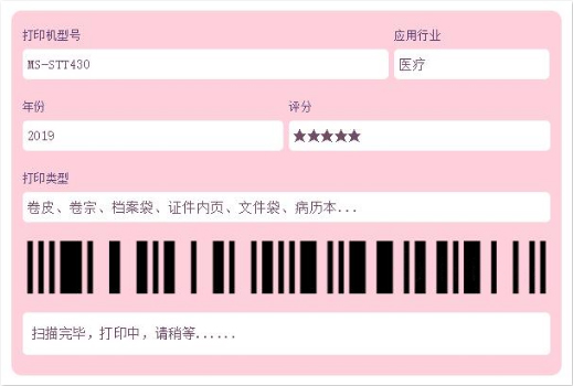美松公司與醫(yī)療器械行業(yè)的合作案例接連不斷,58mm嵌入式打印機(jī)系列之MS-FPT201K被廣泛應(yīng)用于各類醫(yī)療檢測儀器及泌尿系統(tǒng)自助分析檢測機(jī)中;它具有機(jī)身紙倉一體式設(shè)計(jì)且具有面板式嵌入安裝特點(diǎn),更加便捷的被安裝于各類自助終端內(nèi);支持打印統(tǒng)計(jì)圖表的功能,在醫(yī)療器械輸出信息中具有更加直觀的顯現(xiàn)。產(chǎn)品MS-LP212系列則具有打印分離不干膠功能,被廣泛應(yīng)用于醫(yī)院化驗(yàn)科室設(shè)備中,為化驗(yàn)樣本提供標(biāo)簽打印、快速分離底紙和標(biāo)簽,緩解在科室打印量的壓力。日均人流量過萬的門診部門,病歷打印著實(shí)是一個(gè)使院方管理頭疼的問題,美松公司針對(duì)醫(yī)院病歷打印研發(fā)出一系列創(chuàng)新型整機(jī)產(chǎn)品,專門針對(duì)不同打印規(guī)格的病歷本設(shè)計(jì)的可調(diào)節(jié)紙倉打印機(jī)MS-STT430系列,采用碳帶熱轉(zhuǎn)印方式針對(duì)已印刷的卷皮、卷宗、檔案袋、證件內(nèi)頁、文件袋、病歷本等封面進(jìn)行二次加印的打印設(shè)備。