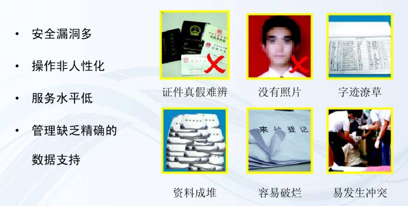 傳統(tǒng)人工手寫的來訪登記方式存在很多安全漏洞,如今假證橫行,辦理假證的犯罪手法也是日漸高明,直接導(dǎo)致門衛(wèi)無法用眼識別真假證件,并且人工登記復(fù)雜、繁瑣、紙質(zhì)登記不易保存查詢信息。網(wǎng)上經(jīng)常有報道訪客手工登記管理漏洞引發(fā)的安全事件接二連三,因為傳統(tǒng)的訪客手工登記存在的問題太多。